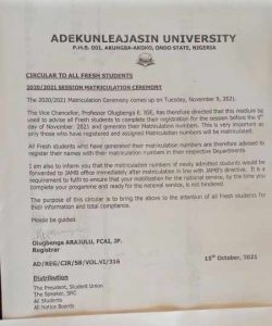 ADEKUNLE AJASIN UNIVERSITY, AKUNGBA AKOKO [AAUA] ANNOUNCES MATRICULATION CEREMONY FOR THE NEWLY ADMITTED STUDENTS 2020/2021 ACADEMIC SESSION