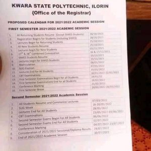 KWARA STATE POLYTECHNIC (KWARAPOLY) RELEASES PROPOSED ACADEMIC CALENDAR 2021/2022 SESSION