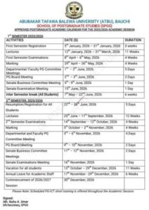The School of Postgraduate Studies (SPGS), Abubakar Tafawa Balewa University (ATBU), Bauchi, has officially released the Senate-approved academic calendar for the 2025/2026 academic session.