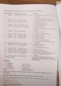 The Vice Chancellor on behalf of the Senate has approved the reviewed Academic calender for the First and second semester of 2020/22 Academic Session as Indicated below.(see second paragraph for the Academic calender)