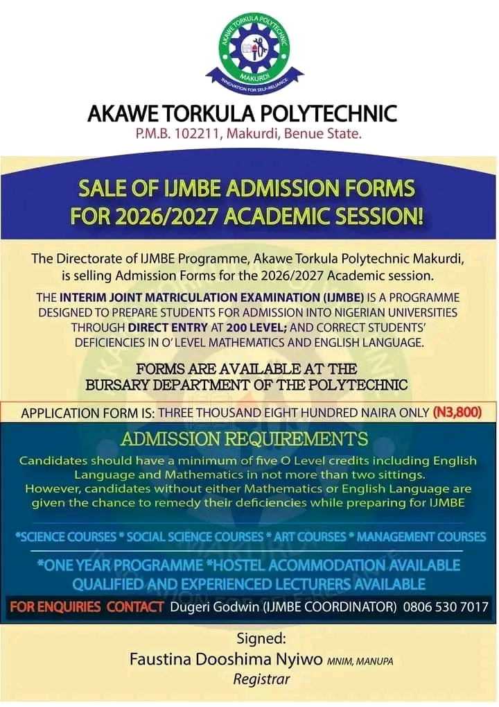 The management of Akawe Torkula Polytechnic (ATP), Makurdi, is pleased to invite applications from suitably qualified candidates for admission into the Interim Joint Matriculation Board Examination (IJMBE) programme for the 2026/2027 academic session.