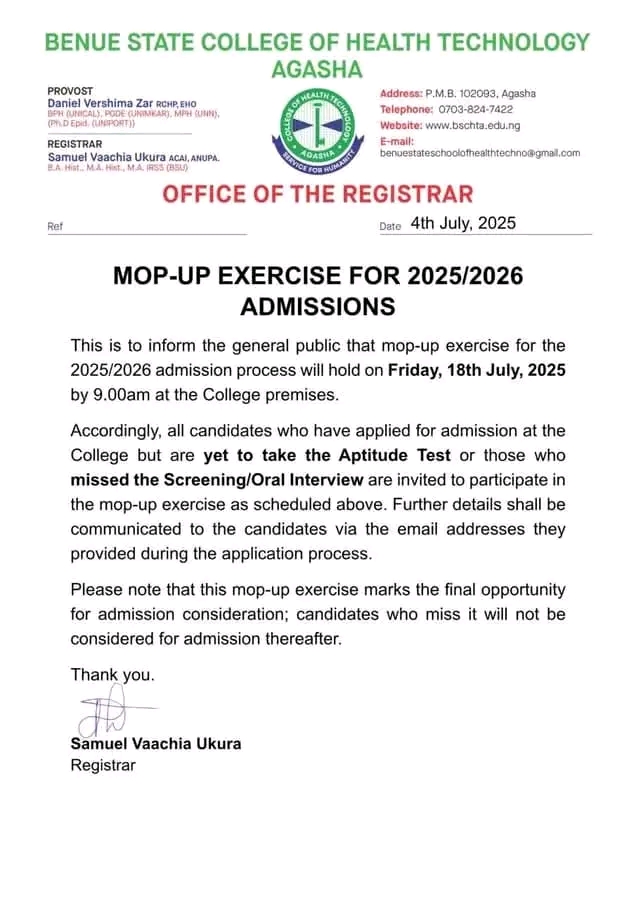 This is to inform all the general public especially prospective students of the Benue State College of Health Technology, Agasha that mop-up exercise for admission for the 2025/2026 admission process will hold on Friday, 18th July, 2025 by 9.00am at the College premises.