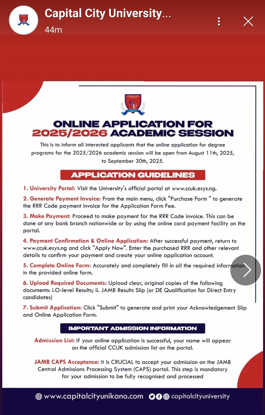 CAPITAL CITY UNIVERSITY, KANO (CCUK) RELEASES POST UTME/DE ADMISSION FORM FOR 2025/2026 ACADEMIC SESSION