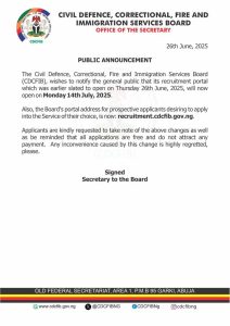 The Civil Defence, Correctional, Fire and Immigration Services Board (CDCFIB), wishes to notify the general public that its recruitment portal which was earlier slated to open on Thursday 26th June, 2025, will now open on Monday 14th July, 2025.