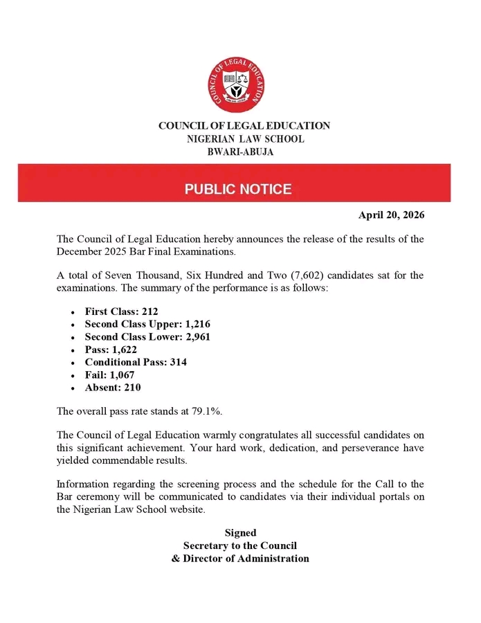 This is to inform the general public, especially the candidates who participated in the December 2025 Bar Final Examinations, that the Council of Legal Education has officially approved and released the academic results.
