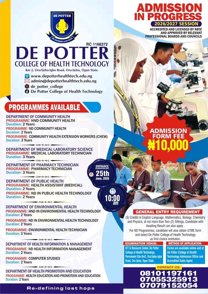 This is to inform the general public, especially prospective students, that the management of De Potter College of Health Technology, Oru-Ijebu, Ogun State, has officially opened the application portal for the 2026/2027 academic session.