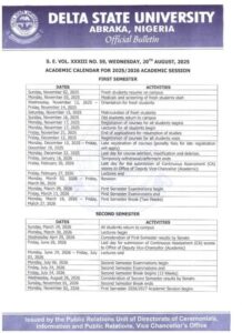 The management of Delta State University, Abraka (DELSU) is pleased to inform all students, parents, guardians, and members of the general public that the official academic calendar for the 2025/2026 academic session has been released.