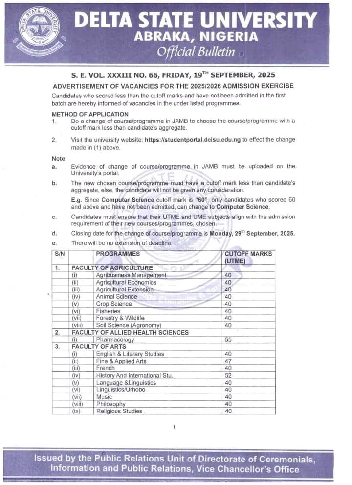 Delta State University (DELSU), Abraka has released a bulletin announcing available vacancies for the 2025/2026 admission exercise. Candidates who did not meet the cut-off marks for their initial choice of programmes can now apply for a change of course into departments with lower cut-off marks.