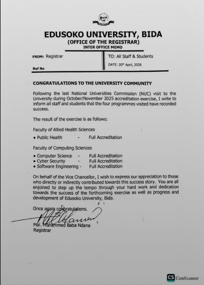 This is to inform the general public, especially staff and students of Edusoko University, Bida, that the management is pleased to announce a significant academic milestone regarding the recent accreditation exercise conducted by the National Universities Commission (NUC).