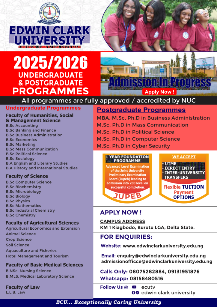 This is to inform the public that the Edwin Clark University has announced sales of Undergraduate and Postgraduate admission form for the 2025/2026 academic session.