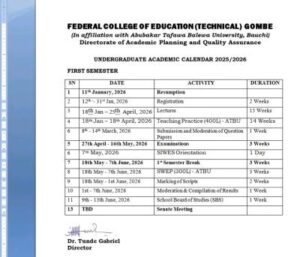 Federal College of Education (Technical), Gombe, in affiliation with Abubakar Tafawa Balewa University (ATBU), Bauchi, has officially unveiled its approved academic calendar for the 2025/2026 academic session. This announcement brings clarity and direction to students, staff, and parents who have been eagerly waiting to know how the new academic year will run. The calendar serves as a guide that shows all the important activities that will take place during the first semester, including registration, lectures, examinations, and breaks. It also helps everyone to plan properly and avoid confusion.