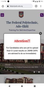 The federal polytechnic ado Ekiti Admissions Board, says only candidates who have uploaded their O Level results will be offered admission on the JAMB Central Admissions Processing System (CAPS).