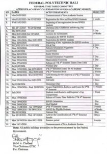 The Federal Polytechnic Bali has officially released its approved academic calendar for the 2025/2026 academic session. The schedule was signed and authorized by Dr. M. A. Clarkson, Vice Chairman of the General Time Table Committee (GTTC).