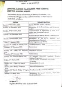 The announcement was officially signed by Soko G.O, the Registrar of the institution. In the circular, the Registrar advised all students and staff to take note of the approved academic dates and comply fully with the schedule.