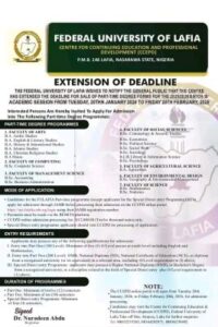 The Federal University of Lafia (FULafia), through its Centre for Continuing Education and Professional Development (CCEPD), has officially announced an extension for the sale of part-time degree application forms. This extension applies to the 2025/2026 Batch ‘B’ academic session.