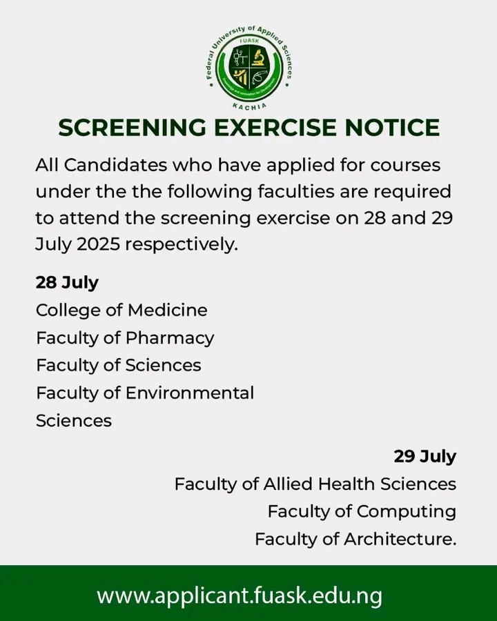 This is to inform the general general public especially the 2025/2026 Academic Session prospective candidates of the Federal University of Applied Sciences, Kachia (FUASK) who have applied for the following courses are required to attend the screening exercise on Monday, 28th July, 2025. Screening starts at 9:00am daily. Applicants are expected to be available by 8:00am.