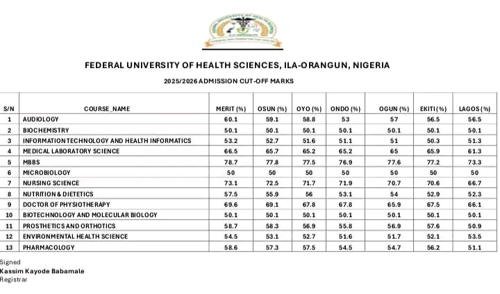 FEDERAL UNIVERSITY OF HEALTH SCIENCES, ILA-ORANGUN (FUHSI) RELEASES ADMISSION CUT-OFF MARKS FOR THE 2025/2026 ACADEMIC SESSION - Campus News