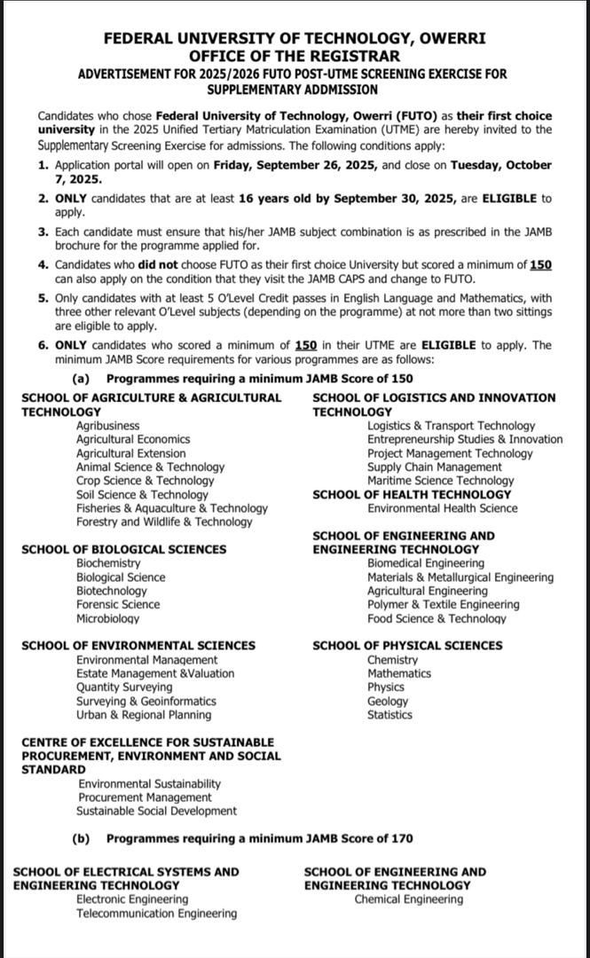FEDERAL UNIVERSITY OF TECHNOLOGY, OWERRI [FUTO] RELEASES SUPPLEMENTARY ADMISSION FORM FOR THE 2025/2026 ACADEMIC SESSION - Campus News