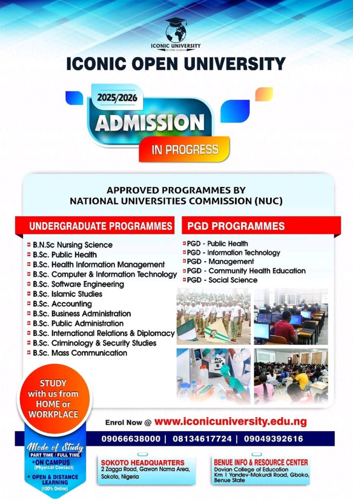 Iconic Open University, Sokoto invites applications from suitably qualified candidates for admission into its degree programmes for the 2025/2026 academic session.