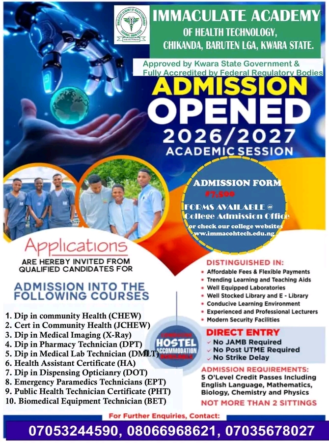 This is to inform the general public, especially prospective students of the Immaculate Academy of Health Technology, Chikanda, that the management has released the admission form for the 2026/2027 academic session.