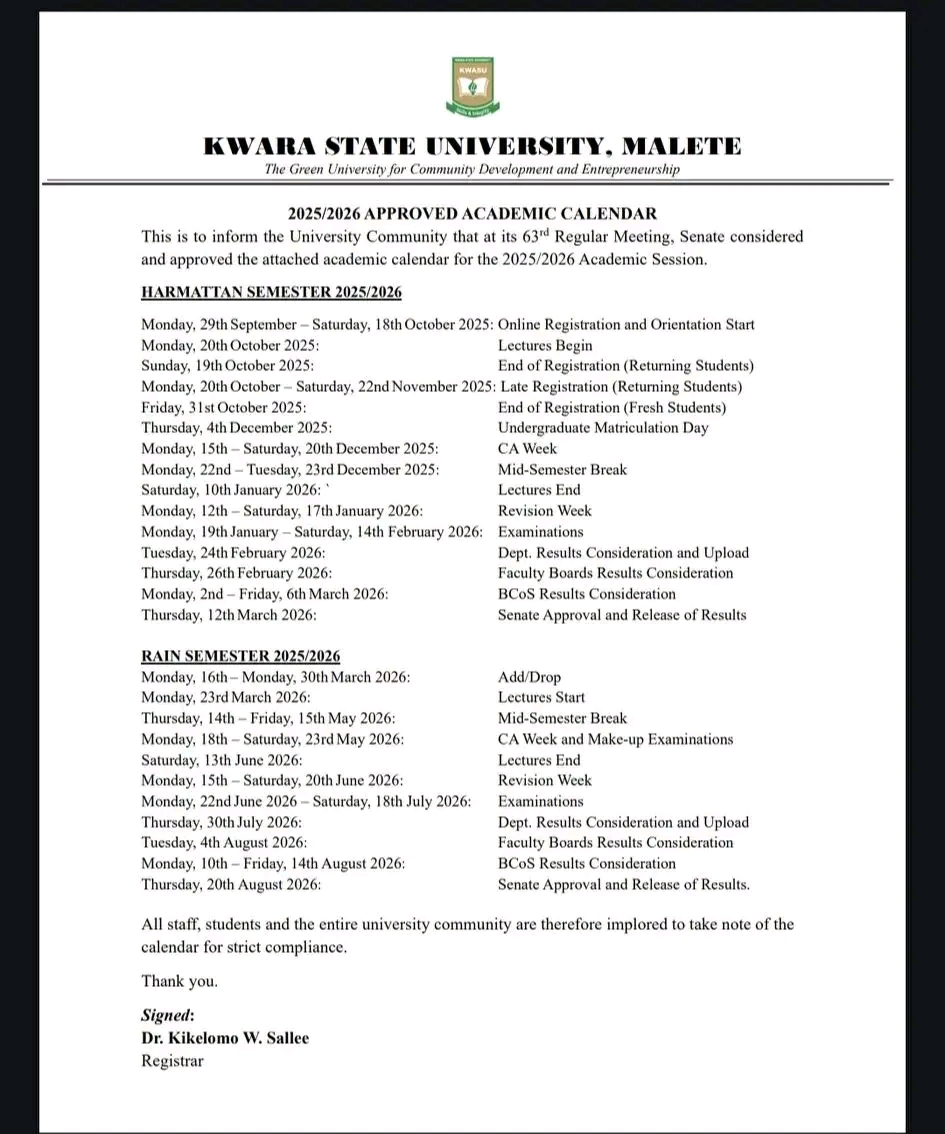 KWARA STATE UNIVERSITY, MALETE (KWASU) RELEASES APPROVED ACADEMIC CALENDAR FOR THE 2025/2026 ACADEMIC SESSION