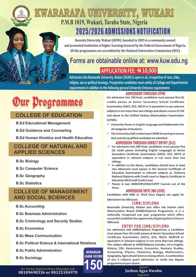 KWARARAFA UNIVERSITY, WUKARI RELEASES POST-UTME/DE ADMISSION FORM FOR 2025/2026 ACADEMIC SESSION - Campus News