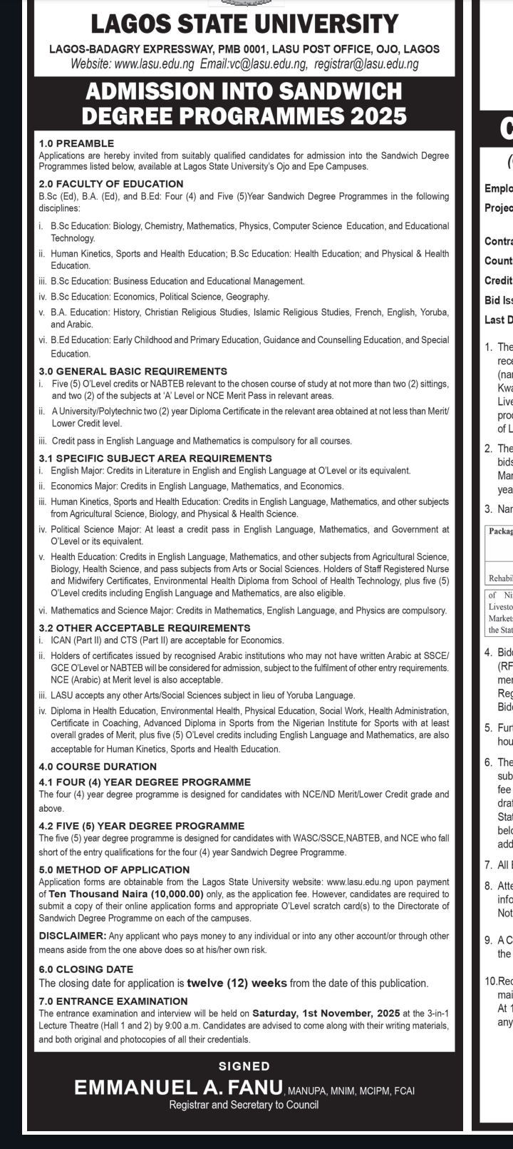 The management of Lagos State University (LASU), Ojo, has officially announced the release of admission forms for its Sandwich Degree Programme for the 2025 Modular Year.