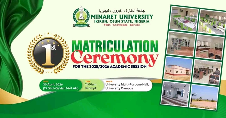 The Management of Minaret University, Ikirun, takes immense pleasure and a deep sense of academic pride in announcing the inaugural 1st Matriculation Ceremony.