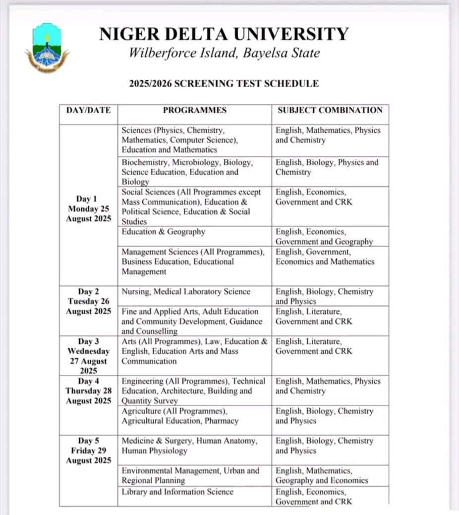 NIGER DELTA UNIVERSITY (NDU) RELEASES POST UTME SCREENING TIMETABLE FOR THE 2025/2026 ACADEMIC SESSION