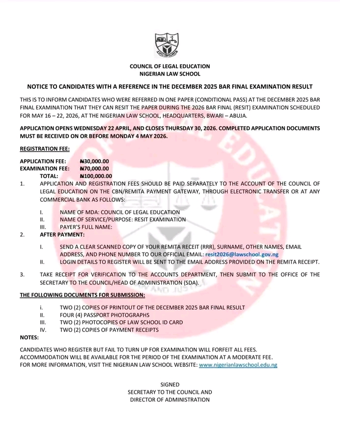 This is to inform candidates who were referred in one paper (conditional pass) at the December 2025 Bar Final Examination that they can resit the paper during the 2026 Bar Final (Resit) Examination scheduled for May 16 – 22, 2026, at the Nigerian Law School, Headquarters, Bwari – Abuja.