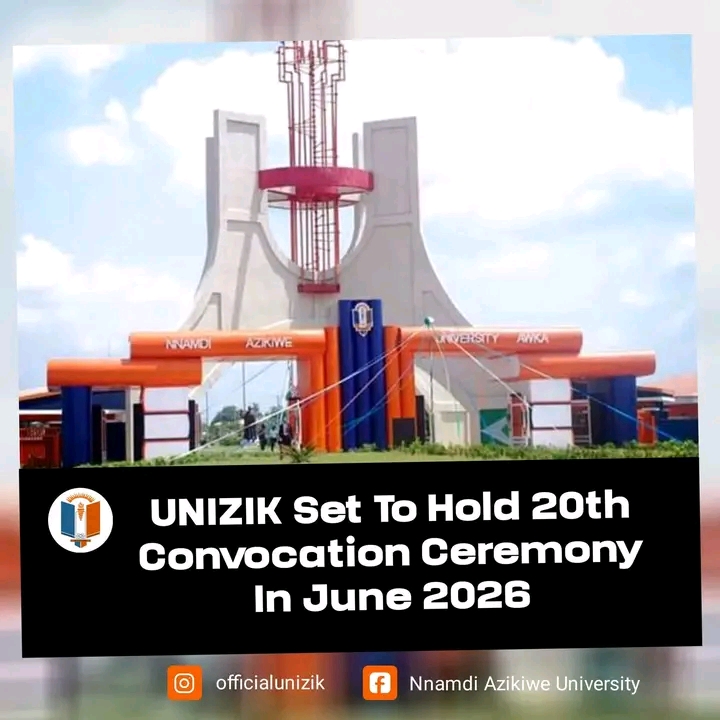 The 20th Convocation Ceremony of Nnamdi Azikiwe University, Awka will hold from Wednesday, June 17th to Saturday, June 20th, 2026.