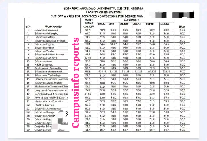 OBAFEMI AWOLOWO UNIVERSITY, ILE-IFE (OAU) RELEASES FACULTY OF EDUCATION ADMISSION CUT OFF MARKS FOR THE 2024/2025 ACADEMIC SESSION - Campus News