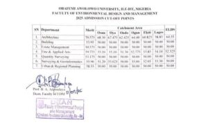 The management of Obafemi Awolowo University (OAU), Ile-Ife has officially released the Faculty of Environmental Design and Management admission cut-off marks for the 2024/2025 academic session.