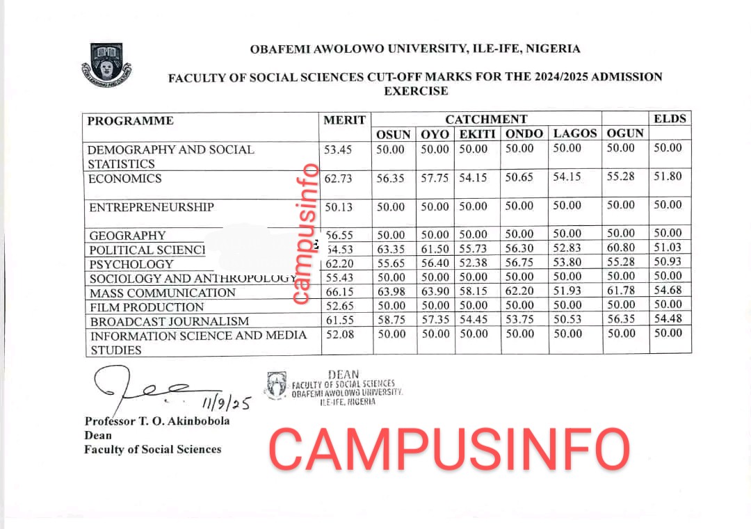 OBAFEMI AWOLOWO UNIVERSITY, ILE-IFE (OAU) RELEASES FACULTY OF SOCIAL SCIENCE ADMISSION CUT OFF MARKS FOR THE 2024/2025 ACADEMIC SESSION