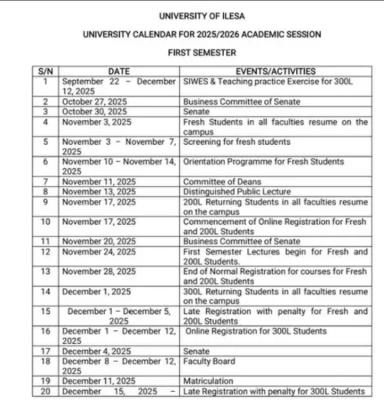 This is to inform all students of the University of Ilesa (UNILESA) that the school management has released the approved academic calendar for the 2025/2026 academic session as follows;