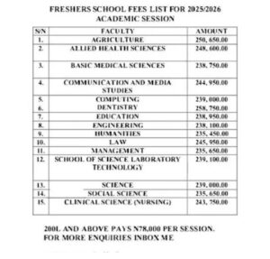 The release of the 2025/2026 school fees schedule serves as an official guide to both freshers and returning students on what to expect financially for the session. While the fees may differ across faculties, they reflect the facilities and resources required for the proper training of students in each discipline.