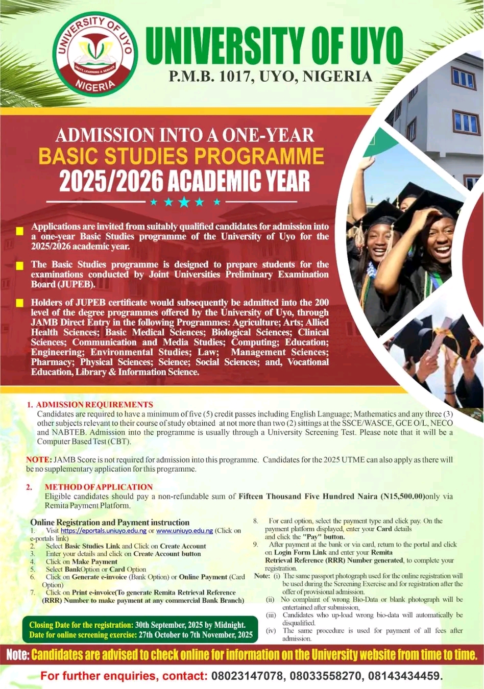 UNIVERSITY OF UYO (UNIUYO) ANNOUNCES ADMISSION INTO BASIC STUDIES PROGRAMME FOR THE 2025/2026 ACADEMIC SESSION